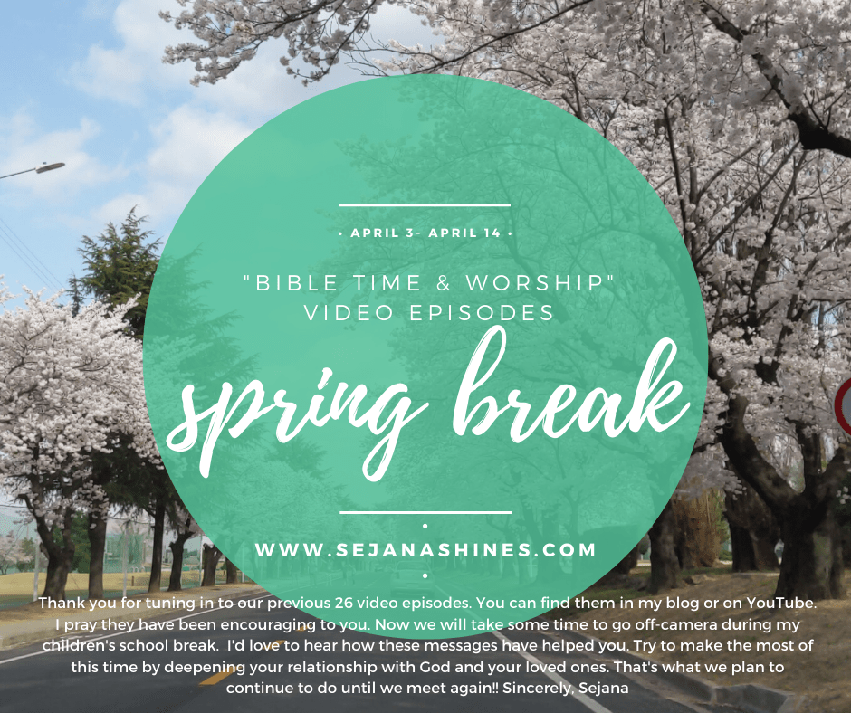 When our military community here in Daegu, South Korea, responded to the news of a cluster of individuals testing positive for the Coronavirus by advising us to stay indoors, I saw the different responses of people. Even those who professed Christ were shaken probably because we cannot control it, we don’t understand it, and it is interrupting our day to day life. I see this as a great opportunity to share the HOPE of Jesus to a world watching and searching online for answers. May you find the Way, the Truth, and the Life. He has a name – His name is Jesus. I have been recording daily messages via Facebook Live at NOON (Daegu time) Monday – Friday and sharing them here each day as “Bible Time & Worship.” I hope it encourages you. Go here for those messages under https://sejanashines.com/2020/03/07/bible-time-worship-every-episode-summary/.