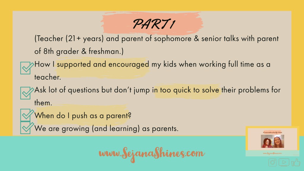 Teacher of 21+ years and parent of a sophomore & senior talks with a parent of an 8th grader & freshman about various struggles in parenting, encouraging other humans as we all do the best that we can, and partnering with teachers to rally a team of support for our future generations.