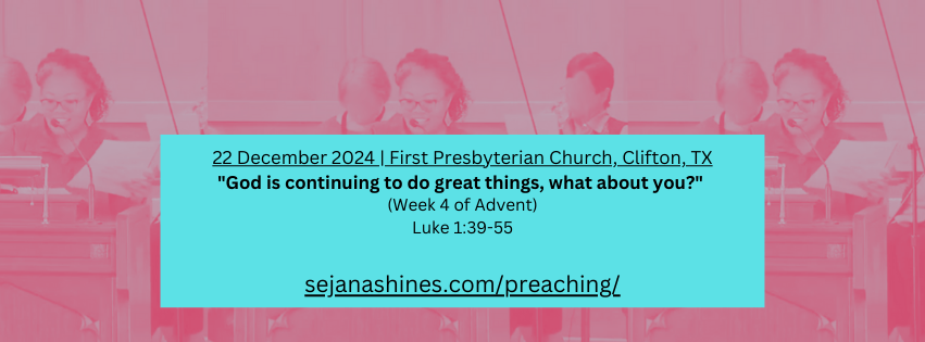 “I’ve got some questions.” Hear me raise a few about Luke 1:39-55 as it pertains to Mary, Elizabeth, me and you. Listen in (or read below) my latest sermon from the Lectionary C text for Advent, preached on 22 December, 2024, at First Presbyterian Church Clifton in Clifton, Texas. Tune in afterwards to hear my background video, recorded when I got back home, later that day. I don’t really want to share it, but I think you should know. (Wait to watch it after hearing my sermon first. Then scroll allllll the way down at the end of this post – disregard all those ads!)