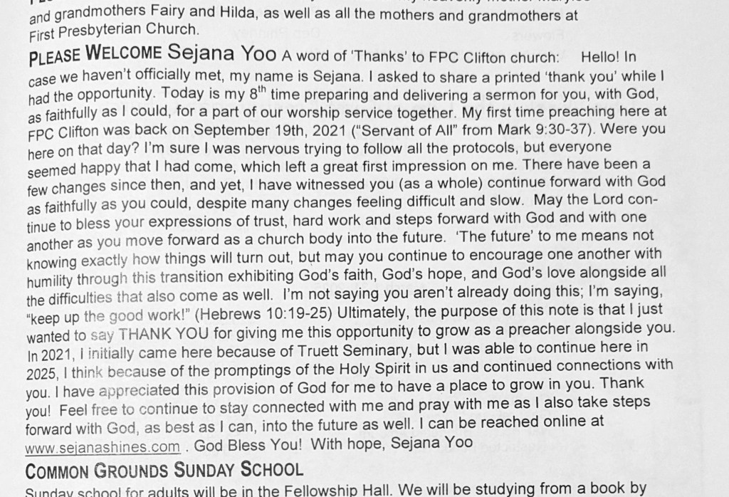 This was my 8th time preaching for FPC Clifton since 2021. I read my ‘thank-you’ letter as this was very likely my last time preaching here as this church’s interim pastor will begin serving next month. I talk about why I don’t focus so much on holidays or specifically on Mother’s Day in my sermons but I did acknowledge my own mother and what this day means to me as a preacher (see the sermon). I also share how I’ve embraced sharing more of myself in my sermons in my in my usual, after-sermon ‘preaching tips’ video recorded when I got back home (see video below).