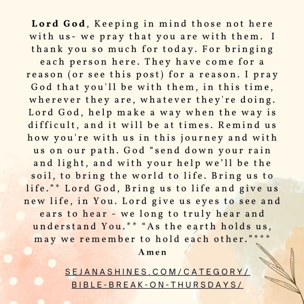 Lord God, keeping in mind those not here with us- we pray that you are with them Lord. I thank you so much for today. For bringing each person here. They have come for a reason (or see this post) for a reason. I pray God that you’ll be with them, in this time, wherever they are, whatever they’re doing. Lord God help make a way when the way is difficult, and it will be at times. Remind us how you’re with us in this journey and with us on our path. God “send down your rain and light and with your help we’ll be the soil, to bring the world to life. Bring us to life.”* Lord God, Bring us to life and give us new life, in You. Lord give us eyes to see and ears to hear – we long to truly hear and understand You.** “As the earth holds us, may we remember to hold each other.”***