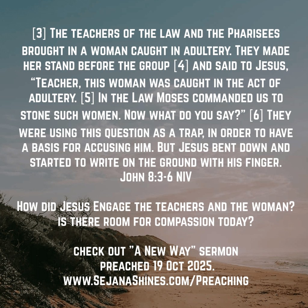 Check out my sermon I preached on 19 October 2025 called “A New Way” from the passage about the woman caught in adultery in John 7:53-8:11 linked below. I offer some thoughts from different scholars to help broaden the message typically shared from this passage (at least from the conservative circles I grew up in). I also call this sermon, “The Amazing Grace of Jesus.” May it encourage you!