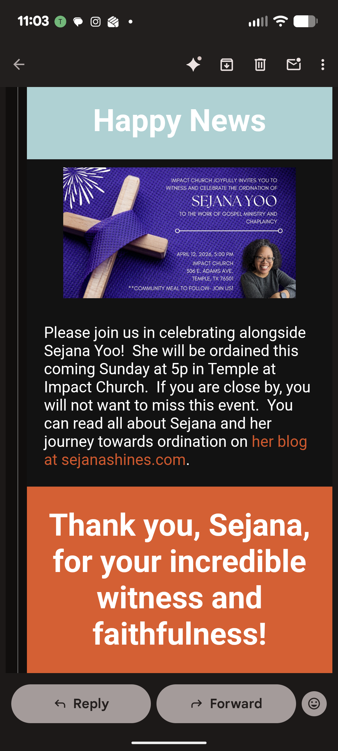 My home church is Impact Temple Church in Temple, Texas. We invite you to witness and celebrate with us my ordination to the work of gospel ministry and chaplaincy the Sunday after Easter. You can check back here to this post as I’ll update it later when the recording is ready to be shared for those who weren’t able to make it. I want to remember and to share this significant milestone in my ministry journey.