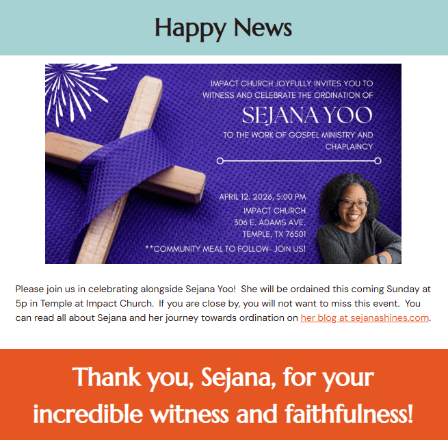 Even though I knew one of my invited guest speakers had already arrived the day before by train from Oklahoma City to speak at my ordination service, I still began to get discouraged. I received message after message of cancellation leading up to Sunday evening’s service due to bad weather, gas prices being high, and busyness from other (important) obligations. I began to wonder, is anyone going to come?