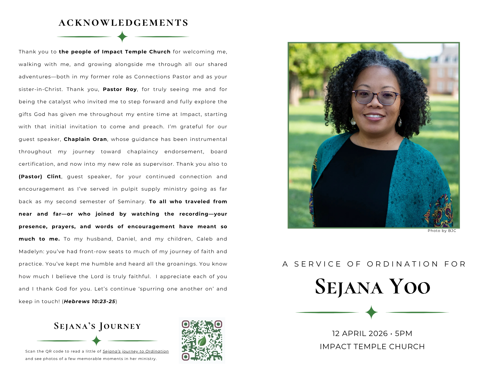 Hi! My name is Sejana Yoo. I shine light on what matters most by empowering and equipping others to do whatever it is they are here to do, well, for the benefit of all we love & serve. I enjoy sharing hope for everyday life to others – from the mundane to the messy. I offer support by sharing learning events and connection opportunities both online & in-person, spiritual direction services, and/or through preaching for pulpit-supply. You can learn more about me here. And You can connect with me in various ways here. May you have Peace! – Sejana