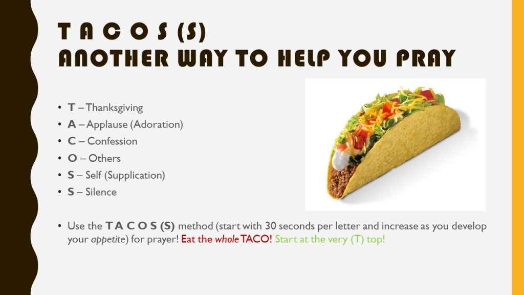 Are you hungry for more prayer? Looking for a new way to spice up your prayer this year? Why not try the T. A. C. O. S. S. prayer method – another way to help you pray! There is nothing fancy about it but there are a few ground rules: 1. You must eat the…